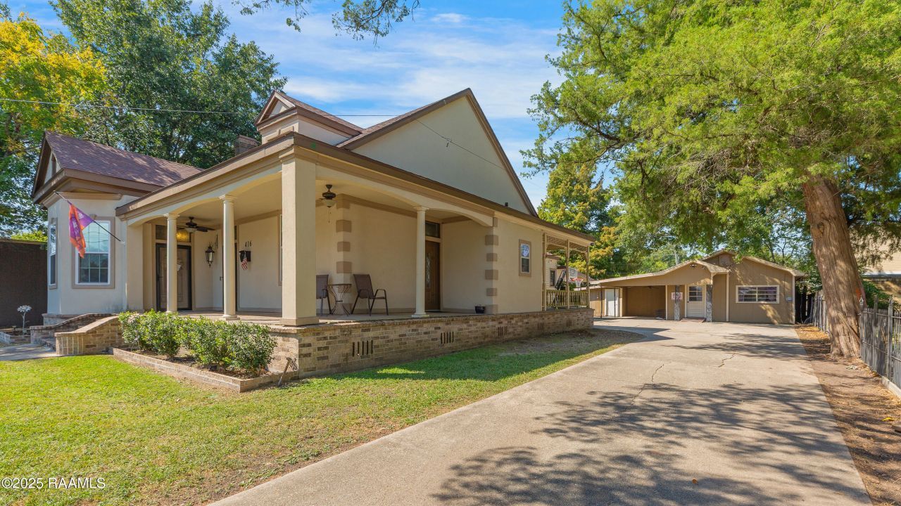 This beautiful 4 bedroom, 2 1/2 bath Victorian home has all the charm of yesteryear with modern amenities. The 2020 roof has 30 year architectural shingles, 2023 hot water heater, HVAC inside components were replaced in 2022. High ceilings, no carpet, 2 original fireplaces, granite counters, beautiful original wainscoting, and newer windows are in most of the home. An extra large living room/den is located off the kitchen. The kitchen has granite countertops, a gas stove, two pantries and a door that opens to the laundry room that has lots of storage. The primary suite has a fireplace, private access to a separate porch and two closets. The primary remodeled bathroom has a large separate shower, a separate tub, a dual vanity and an original stained glass window. The front porch wraps around the front of the home and is accessible from two bedrooms. There are storm doors, an alarm system, and updated windows. The home and yard are completely fenced and a beautiful wrought iron fence and gate are across the front of the home. Included in the sale is a detached 500 sq ft home with private parking. Flood insurance is not required.