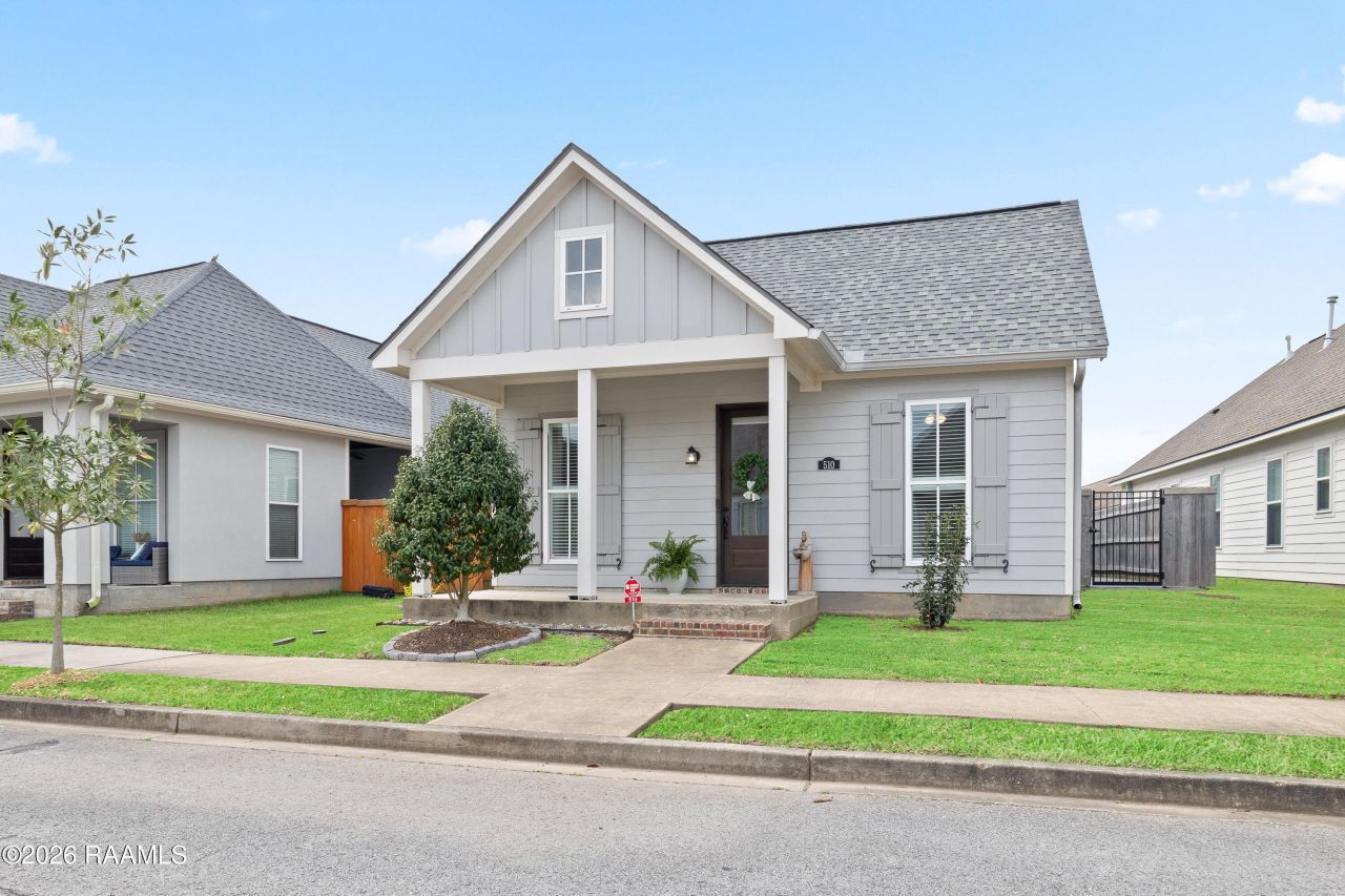 Welcome to Couret Farms a community known for its front porch lifestyle, walkability, and charming neighborhood feel. This Lilian Farmhouse by Manuel Builders offers 3 bedrooms, 2 bathrooms, and 1,540 square feet of thoughtfully designed living with minimal yard maintenance, allowing you to spend more time enjoying the neighborhood. The inviting front porch sets the tone for relaxed living and great curb appeal. Inside, tile and vinyl plank flooring flow throughout the home, creating a warm and cohesive space. The open living area flows seamlessly into the kitchen, featuring granite countertops, stainless steel appliances, ample cabinetry, and a layout perfect for both everyday living and entertaining. A split floor plan provides privacy, with spacious bedrooms and walk-in closets. The primary suite is tucked away and features an ensuite bath with granite countertops and generous closet space. Both bathrooms offer updated finishes and stylish details. Outdoor living continues with a covered patio and extended brick paver space, ideal for relaxing or entertaining. The two-car garage includes a painted and sealed floor for a clean finished look. Seller upgrades include updated flooring, refreshed lighting in the kitchen and baths, custom plantation shutters, functional exterior shutters, added bedroom wainscoting, gutters, iron side gate, patio pavers with sealed concrete, and a new front door.Refrigerator, Ring doorbell, shades, and blinds remain with the home. Enjoy the charm, community, and lifestyle that make Couret Farms one of Upper Lafayettes most desirable neighborhoods. Schedule your private showing today.