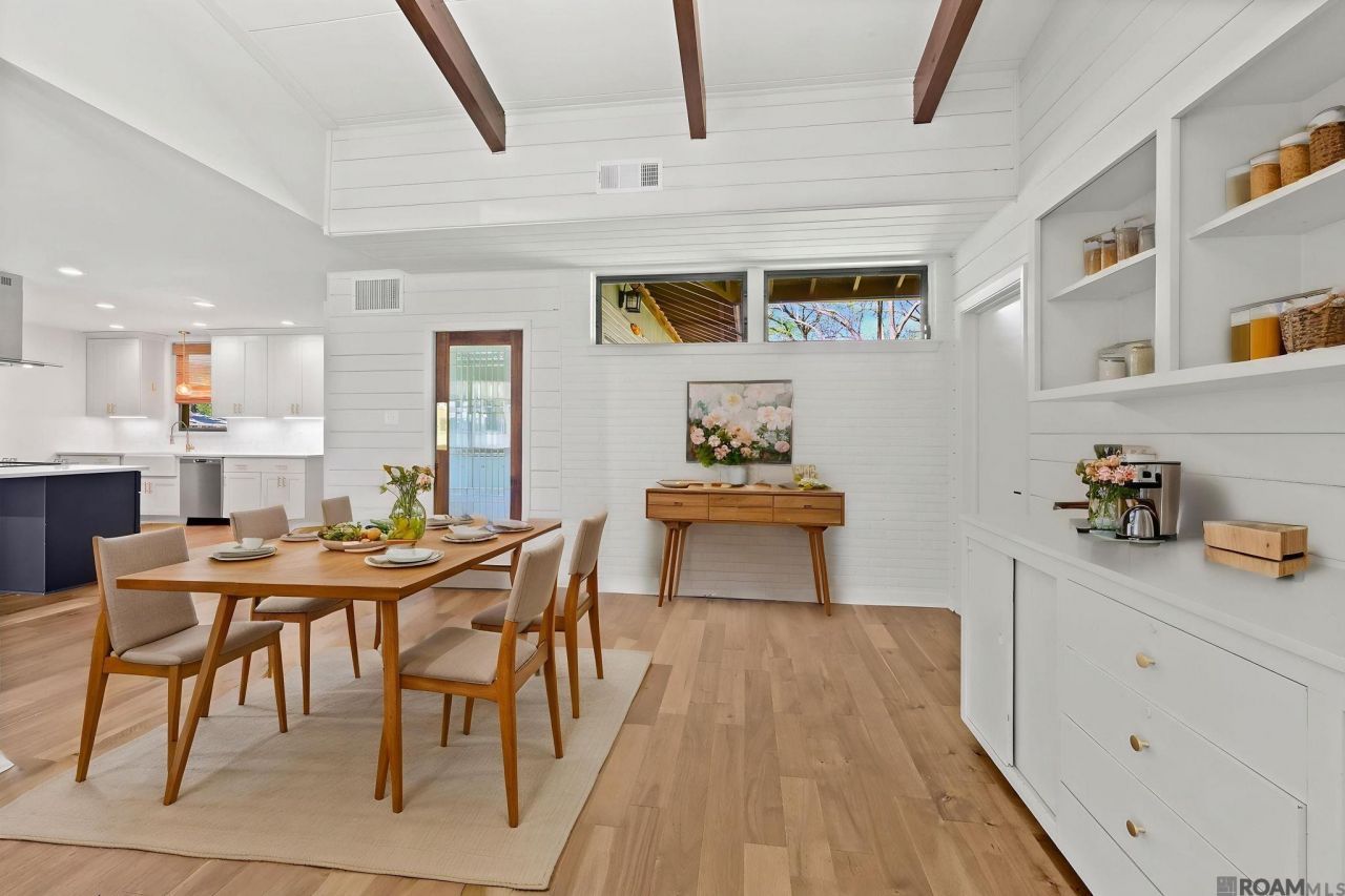 Welcome to this beautifully renovated Mid-Century Modern home, perfectly nestled between Old Goodwood and vibrant Mid-City?one of Baton Rouge's most sought-after locations. Set on an expansive, nearly half-acre lot, this 4-bedroom, 2-bath residence offers over 2,500 square feet of thoughtfully designed living space. Originally built in 1959, this home has been meticulously updated while honoring its timeless architectural character. Soaring wood-beamed ceilings, striking panoramic windows, and clean mid-century lines create a warm, inviting atmosphere filled with natural light. The open-concept living, dining, and kitchen area is ideal for both everyday living and entertaining. The updated kitchen features stainless steel appliances, custom cabinetry, a spacious center island, and a pantry?blending style and functionality seamlessly. The primary suite is a true retreat, offering a spa-inspired bathroom complete with a double vanity, relaxing jacuzzi tub, and multi-head shower. Original built-ins add charm and character, while the flexible fourth bedroom provides the perfect space for a home office, guest room, or creative studio. Enjoy year-round comfort in the large, air-conditioned sunroom overlooking the beautifully landscaped backyard creating effortless indoor-outdoor living and the perfect setting for gatherings or quiet evenings at home. Located just moments from Goodwood Park, Superior Grill, and Mid-City's popular restaurants and coffee shops and only minutes to LSU and downtown?this home offers the ultimate blend of convenience and lifestyle.Located in Our Lady of Mercy Parish. Don't wait schedule your tour today!