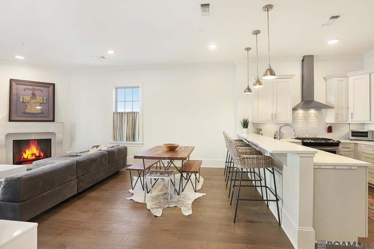 Enjoy all that Willow Grove has to offer with the convenience of condo living! Beautiful spacious one BR condo featuring 10' ceilings, wood floors throughout with tile in bath and laundry area, fireplace with stone mantle and gas logs, quartz counters in kitchen and bath and crown molding throughout. Kitchen has pantry, under counter lighting, upper end cabinets with soft close drawers and stainless-steel appliances with gas range and refrigerator! Residents only entry system. One covered allocated parking spot. COA dues include use of Willow Grove neighborhood pool and all benefits of Willow Grove home ownership. Dining and shopping just steps from your door! Refrigerator, washer, and dryer to remain.